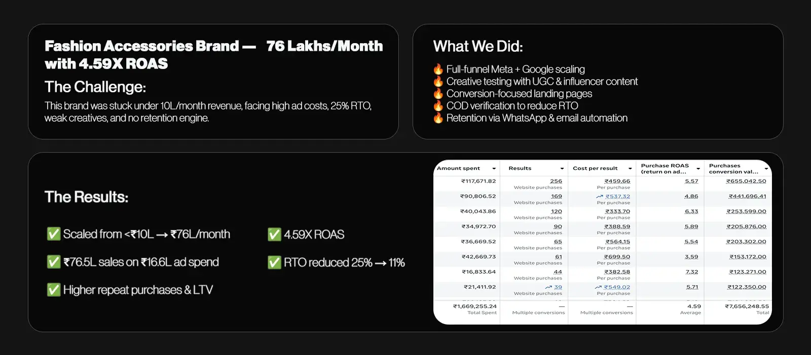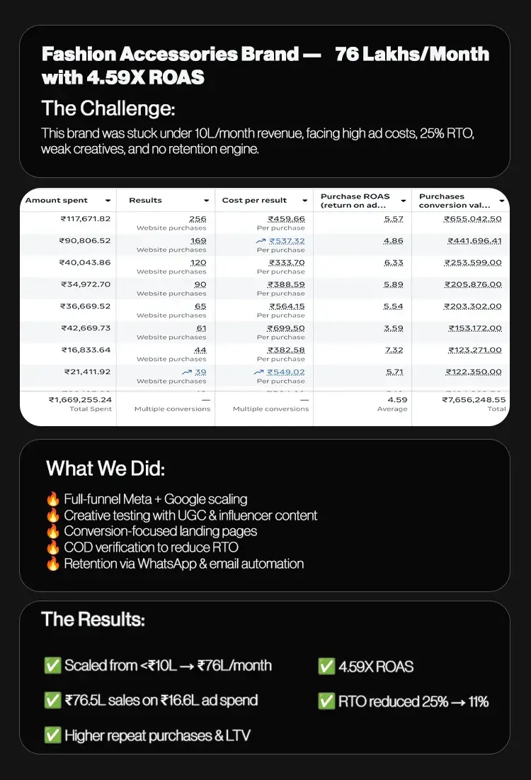 80K → 10L/month in 12 months. RTO: 40% → 5%. We made it happen with ad scaling, creative testing, retention marketing, CRO, and COD optimization — the same playbook top brands use.