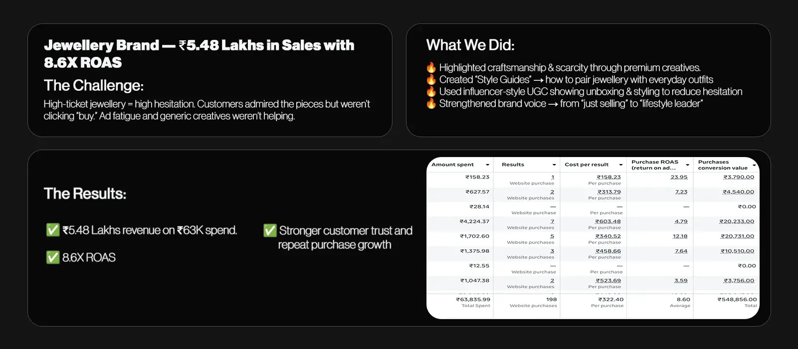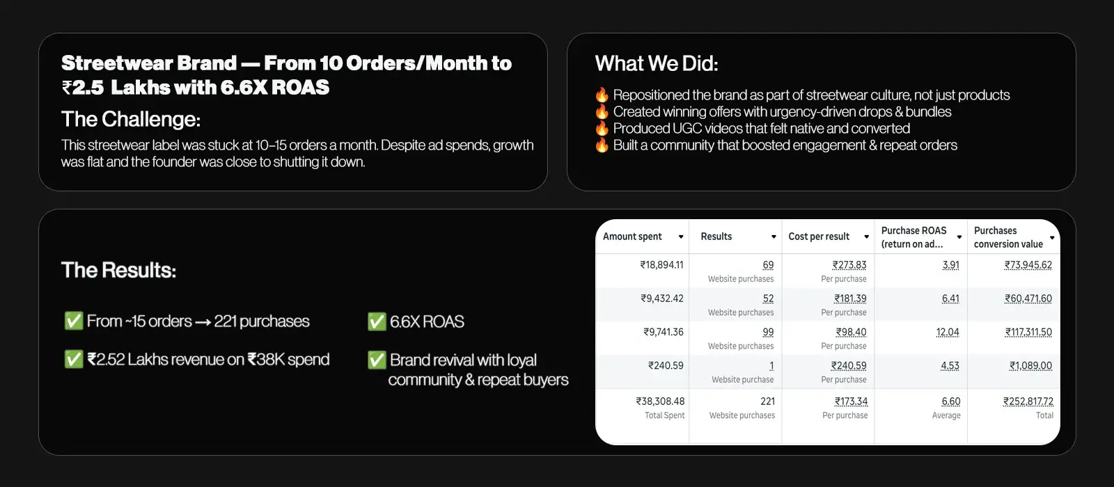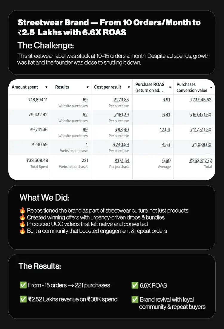 Most brands fail because of weak creatives, poor funnel setup, and no retention strategy. We fix the foundation first — then scale. Our case studies show consistent ROAS improvements even for struggling brands.