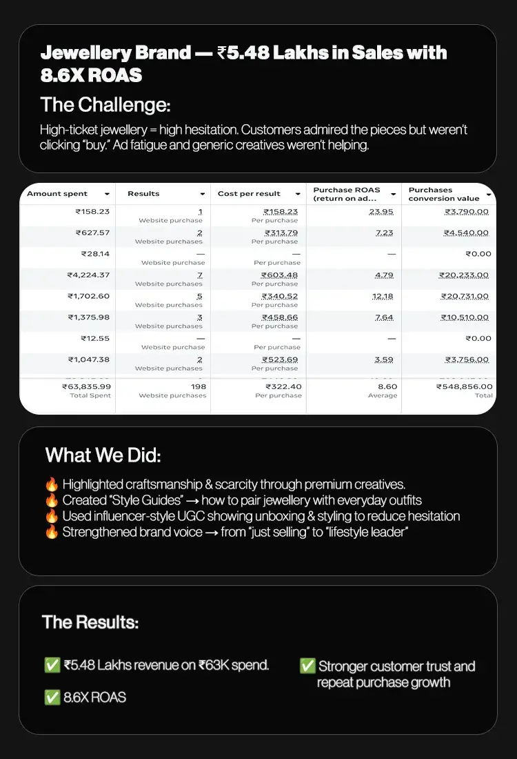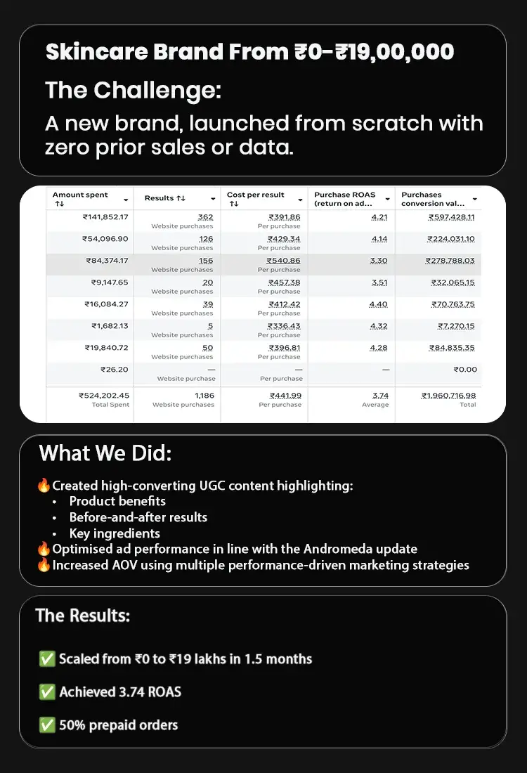 No agency can guarantee sales — but we guarantee a proven process: full-funnel ads, creative testing, retention marketing, and CRO. These are the same frameworks that scaled our clients from lakhs to crores.