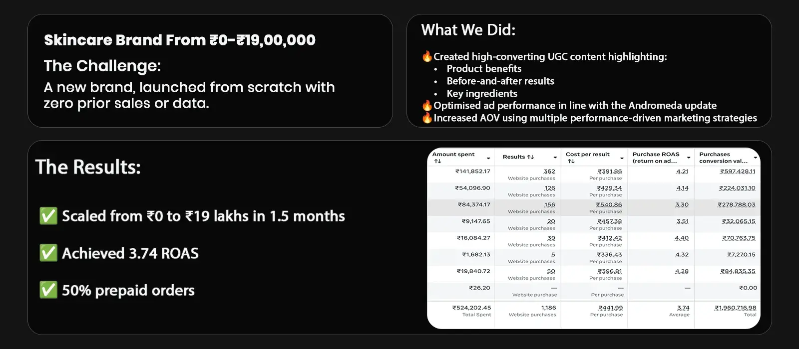 80K → 10L/month in 12 months. RTO: 40% → 5%. We made it happen with ad scaling, creative testing, retention marketing, CRO, and COD optimization.